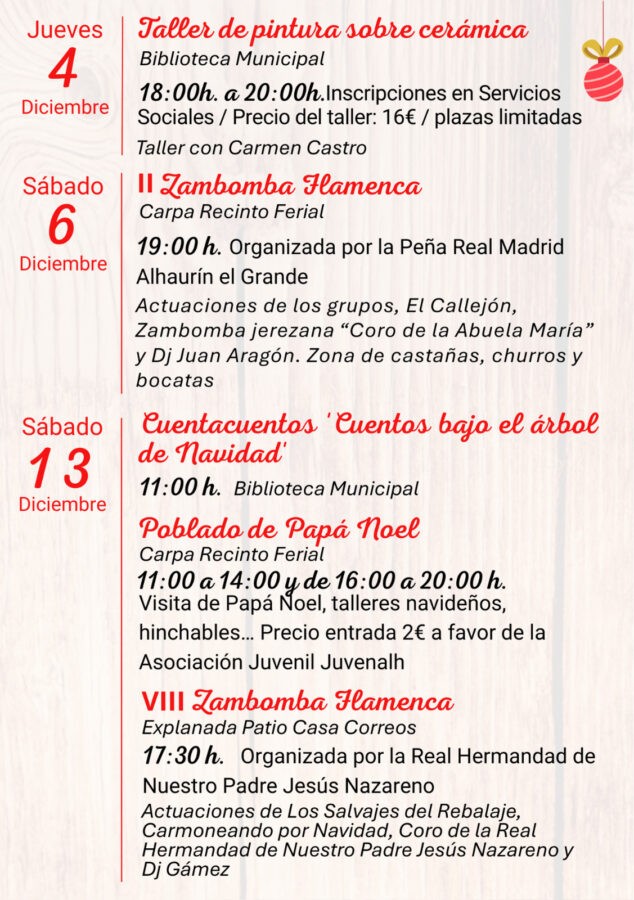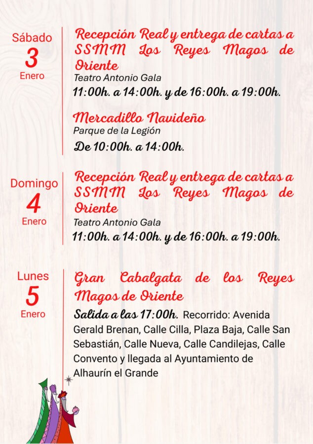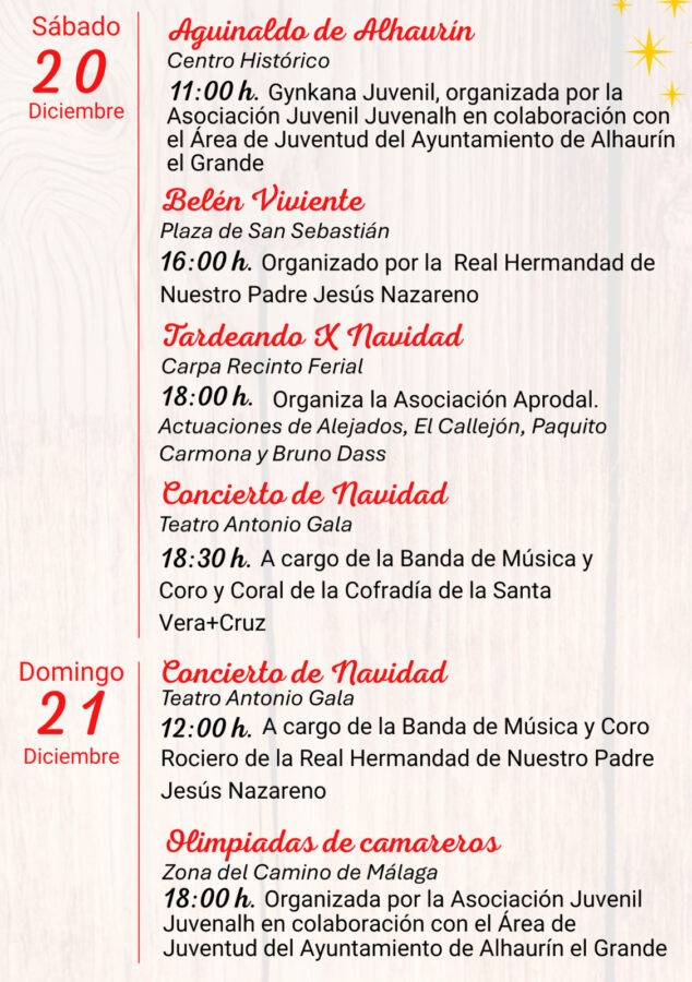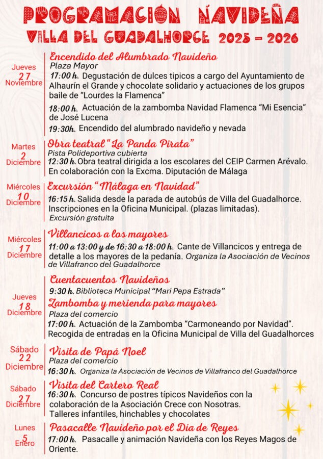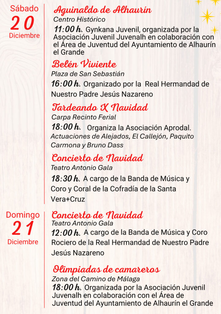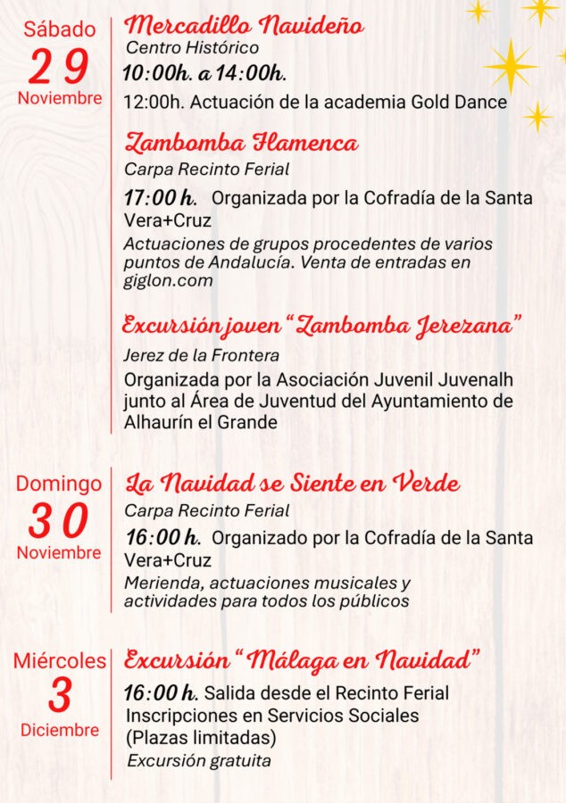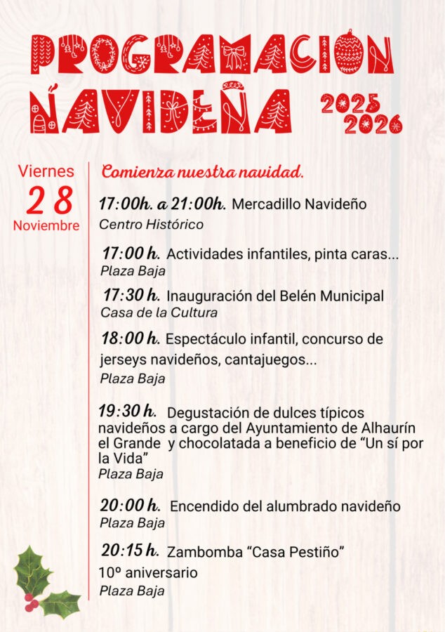 El Ayuntamiento de Alhaurín el Grande ha presentado este 24 de noviembre el programa de la Navidad 2025-26. Entre las principales novedades, destacan la celebración de una fiesta de Año Nuevo y el cambio de recorrido de la Cabalgata de Reyes. Es el siguiente: